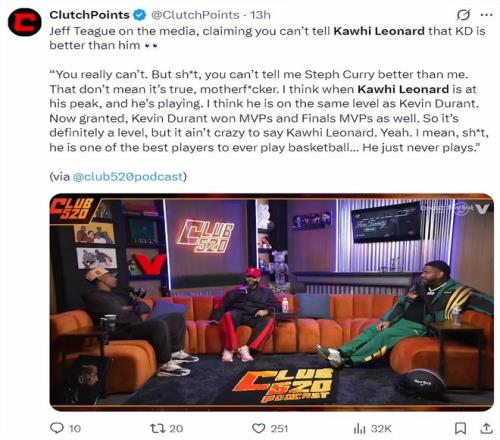 前NBA球员杰夫-蒂格也谈到了伦纳德本赛季的表现,他表示:你们不能说凯文-杜兰特比伦纳德更强。伦纳德处于巅峰状态且健康时,我认为他的水平跟杜兰特是一致的,虽然杜兰特赢得了MVP与FMVP,所以确实有一点差距,但说伦纳德不比他差也不算离谱。我是说,他真的是NBA历史上最顶级的球员之一…… 就是老不打比赛。