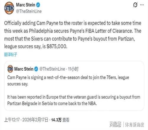 北京时间2月17日,恰逢农历大年初一,在此先给各位球迷朋友拜个年!虽然最近三天NBA赛事暂歇,但联盟的动态依旧精彩纷呈。今日,据知名NBA记者Marc Stein透露,76人队即将签约后卫卡梅隆-佩恩,这一消息无疑为节日增添了几分喜庆。