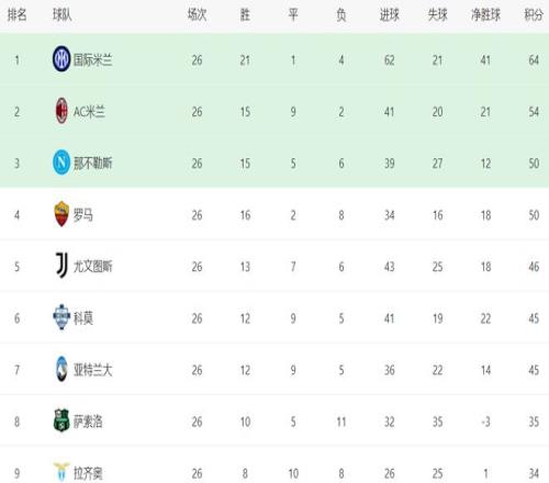 在积分榜上,国际米兰遥遥领先。国际米兰21胜1平4负,拿到64分,排名榜首。而AC米兰输球后,依然是54分,排名第2,整整落后国际米兰10分。冠军的归属基本没有悬念了。那不勒斯50分,排名第3。罗马赢球后,积分已经追平那不勒斯,也是50分,排名第4,但因为与那不勒斯两回合交手战绩处于劣势,只能排在那不勒斯身后。尤文图斯只拿到46分,排名第5,被罗马甩开4分。科莫和亚特兰大都是45分,排名第6和第7。