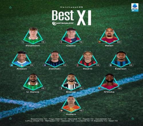 意甲官方公布了联赛第25轮的最佳阵容,莫德里奇、泽林斯基、布雷默、马伦在列。