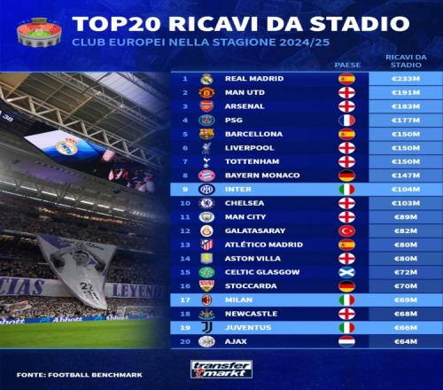 体育播报2月17日宣 德国转会市场列出了上赛季欧洲俱乐部主场门票收入排名,皇马2.33亿欧居首,曼联1.91亿欧次席。